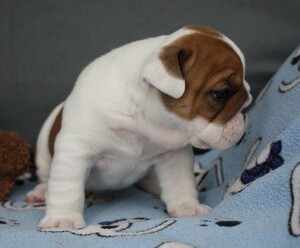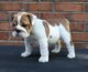 Bulldog Inglês macho com 14 semanas, com o temperamento típico da raça: dócil, leal, muito afetuoso, brincalhão mas tranquilo e bastante apegado às pessoas.